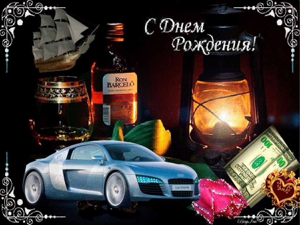 Отличная гифка «с днем рождения» для мужчины: красивый автомобиль, мужские пожелания. 10 из 10.