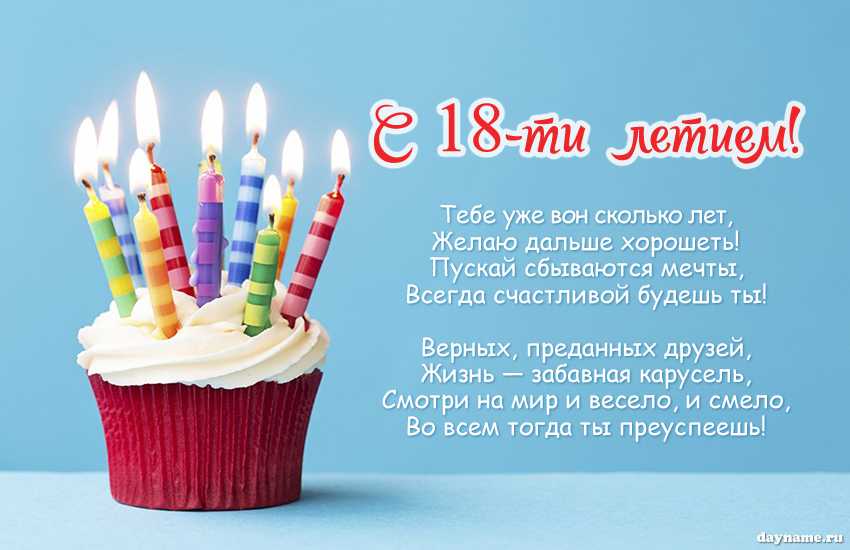 Сегодня самый лучший праздник на земле, Тебе исполнилось уж 18 лет, Все комплементы и пожелания тебе, Пусть долго длится сиреневый рассвет. Пусть сказкой будет жизнь твоя, Пускай осуществляется мечта, Счастливой и весёлой будь всегда, Пусть балует тебя судьба.