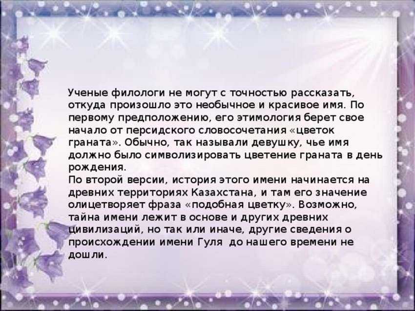 Кое-что уже было сказано выше, об арабском происхождении и гранатовом цветке. По персидской версии, так называли девочек, родившихся в период цветения этого растения. Упоминается также казахская версия, существует толкование «горицвет», возможны другие варианты, но широкой общественности они неизвестны. Точное происхождение пока не выяснено, хотя филологи весьма усердно занимаются этим. Вариации имени вроде Гельнары или Наргуль имеются у множества народов, и всех их ласкательно называть можно Гулей.