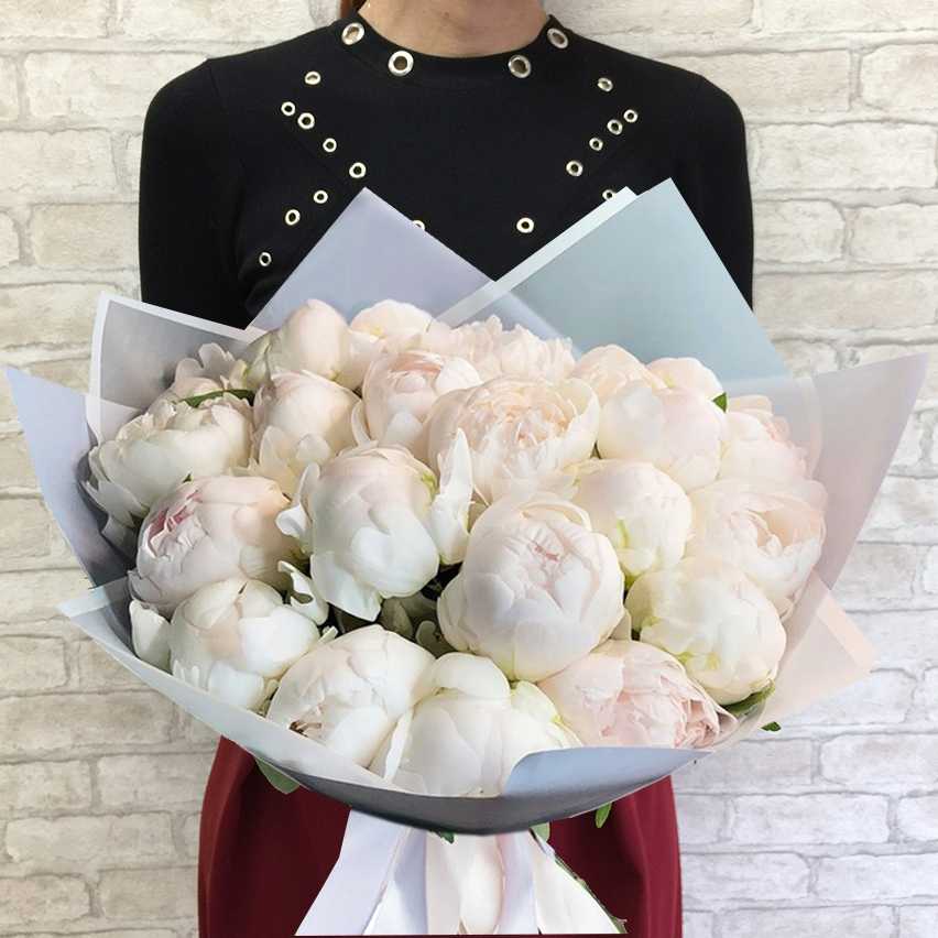 В подобных сочетаниях пионы в букете смотрятся еще более нежными и пышными.