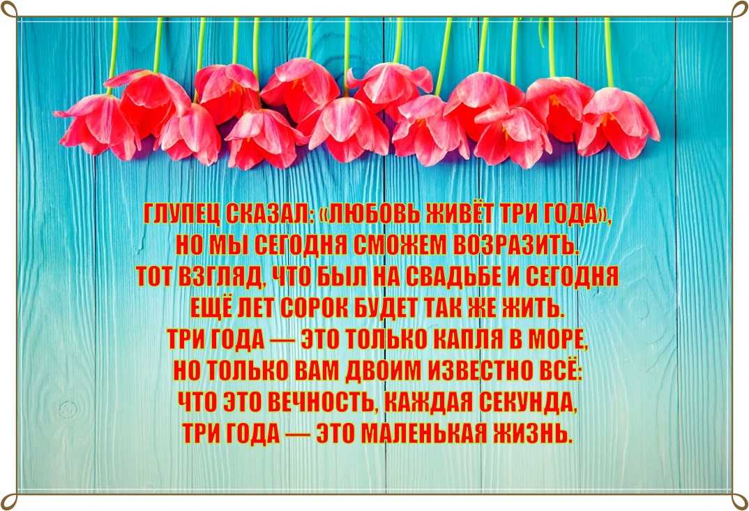 Делим радости, невзгоды Мы с тобой уже три года, Муженек мой дорогой Буду я всегда с тобой! Пожелать хочу тебе Здоровья крепкого втрое, Чтобы не было страдания, Семье нашего процветания. Чтобы мы с тобой друг другу Было лучше супруги, Будем мы любовь хранить, Наших детишек растить!