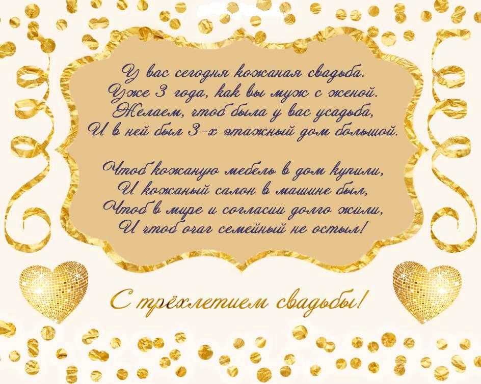 3 года прожили мы вместе, Сегодня снова жених и невеста, От слова «Горько!» — сладость на губах, Искорки счастья мерцают в глазах. С кожаною свадьбой, муж, поздравляю, Жизни сказочной искренне желаю, Пускай удача не проходит мимо, Будь всегда весёлым и счастливым.
