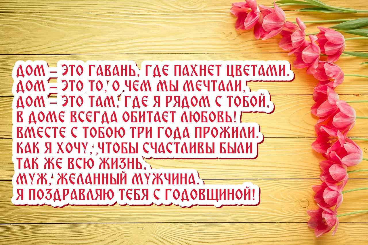 С трехлетием совместной жизни, Любимый муж, я поздравляю. Любви большой и процветания Союзу нашему желаю. Пусть только крепнут наши чувства И удается пусть нам все, Не страшно в жизни мне ни капли, Ведь рядом крепкое плечо.