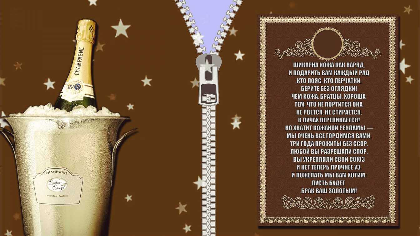 Три года! Кожаная свадьба, Историю творим сейчас, Мой муж, поздравить тебя рада, Что этот день, только для нас. Мы тонко чувствуем друг друга, И крепнет силой наш очаг, Любовь сильна, она упруга, Как кожаный над домом стяг.