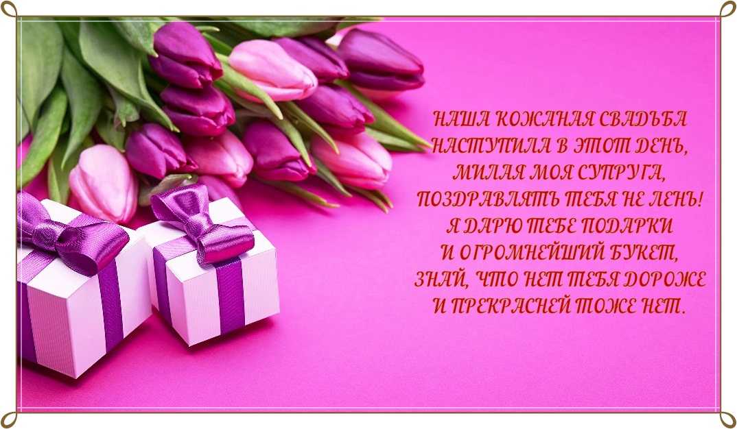 Дорогой муж, поздравляю с нашей 3-ей годовщиной, с кожаной свадьбой! Желаю, чтобы наша дальнейшая жизнь была такой же красивой и благополучной, как и в эти 3 года. Оставайся для меня таким же любимым, самым хорошим, добрым, веселым и искренним. Пусть наша семейная чаша с каждым годом пополняется счастьем, достатком, успехом, радостью и добром.