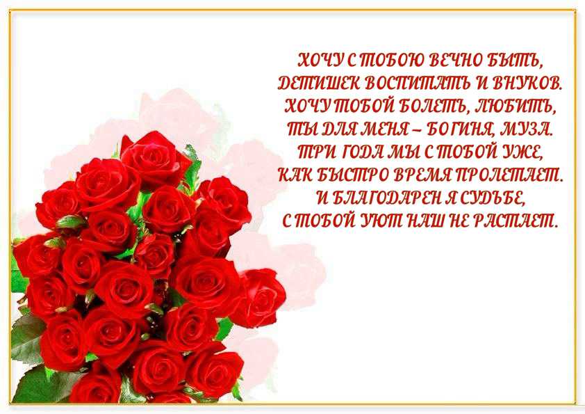 Три года быстро пролетели, А мы, любимый и родной, Смогли пройти дожди, метели И самый ярый летний зной! С тобою, знаю, мне надежно, Опора ты — моя стена! Мне описать безумно сложно, Насколько счастья жизнь полна! Мы за три года стали ближе, Друг друга любим все сильней, Ведь сведены мы сильной свыше И нету чувств любви важней!