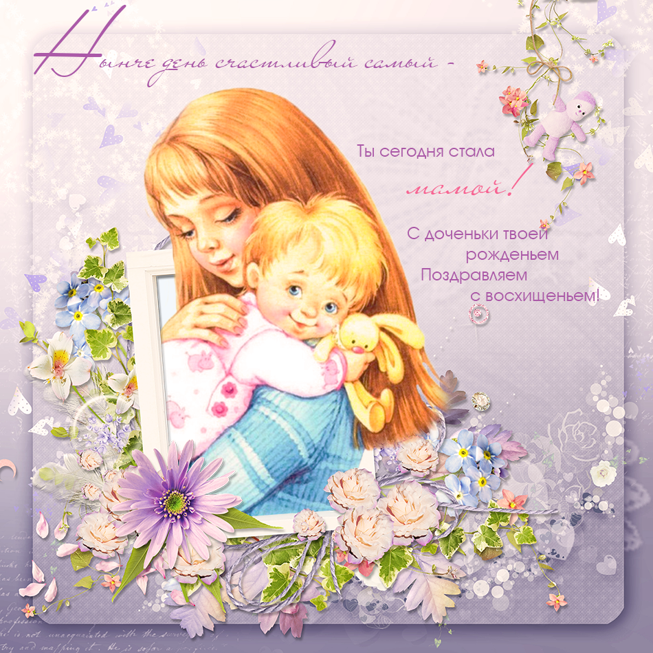 С днем рождения дочери – картинка для мамы. Нынче день счастливый самый – Ты сегодня стала мамой! С доченьки твоей рожденьем поздравляем с восхищеньем!