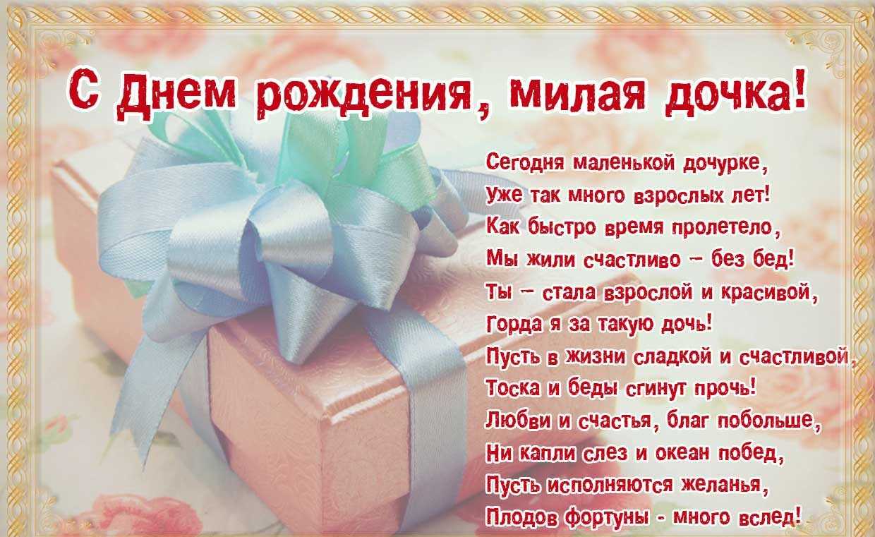 С днем рождения доченька! Поздравляю дочурка родная, с этим ярким и праздничным днем. Ты живи и цветком расцветая, всех согрей своим алым огнем! Чтоб жизнь жила без ошибок, чтобы спутницей радость была, только моря любви и улыбок, океана добра и тепла!