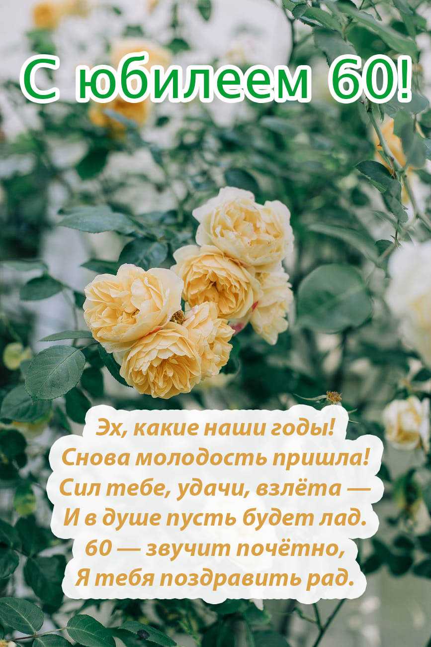 60 — активный возраст,Время жить и строить планы.На заслуженный, на отдыхВам пожалуй еще рано.Ваши знания и уменьяМастерство, бесценный опытНужны людям без сомненияИ в быту и на работе.Импозантный и солидныйИ костюмчик, стильный, модный.Вы мужчина очень видный,Скажу больше — благородный.И не думайте про годы,Время не воротишь вспять,А по жизненной дорогеДолго вам ещё шагатьВместе со своей супругой?Делясь с людьми семейным счастьем,Ведь созданы вы друг для другаА вместе не страшно ненастье.Пусть ваши дети и внучатаВас окружат теплом, любовьюИ быть желаю вам богатымУдачей, силой и здоровьем!