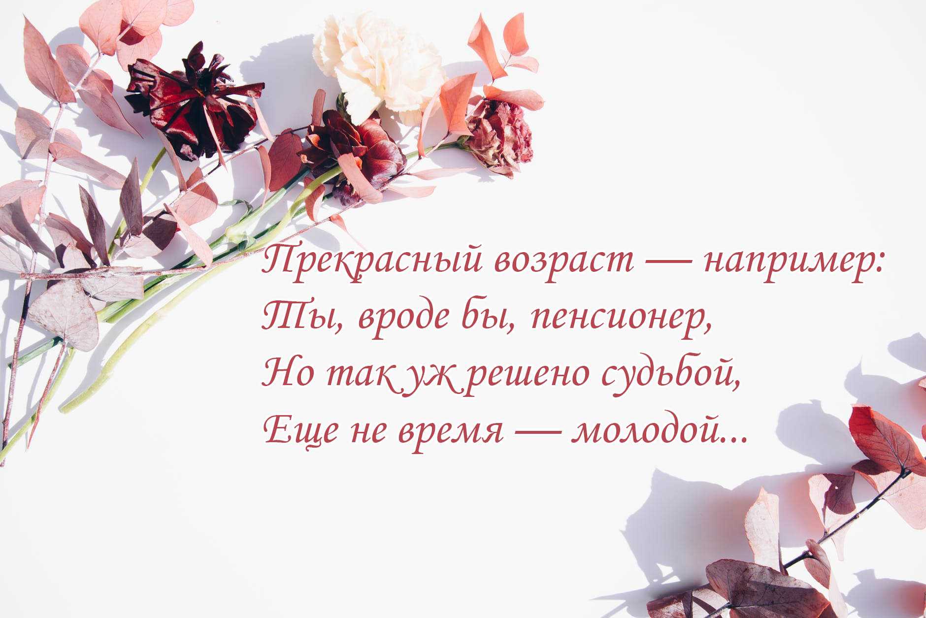 На самом деле, шесть десятков летОтличный возраст для успехов и открытий,Новая жизнь полна размеренных событий,Мы изучаем снова этот белый свет.Выход на пенсию — это для нас свобода:С утра не надо мчаться нам на службуИ заставляться себя трудиться там натужно,Нас ждёт рыбалка, дача, отдых и природа.Там свежий воздух, лес, вишнёвый сад,В душе свобода, будто снова восемнадцать,Жизнью такою вам желаю наслаждатьсяКак минимум еще лет шестьдесят.