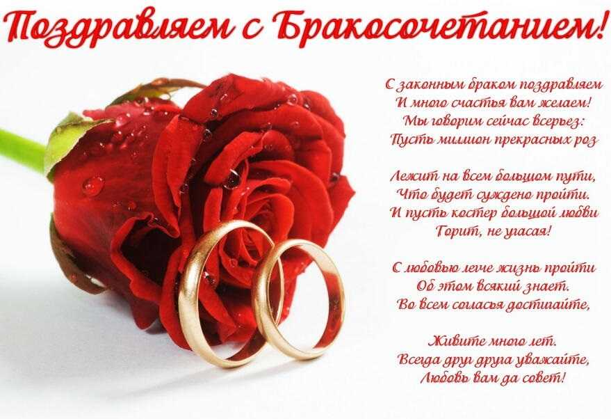 С законным браком поздравляем!Любви и радости желаем,Чтоб жили в мире и достатке,Чтоб отношения были гладки.Чтоб вечерами не скучали,В кроватке деток вы качали,Щедры чтоб были и богаты,Вдвоем встречали все закаты.Чтоб не встречаться вам с разлукой,Детей растить, дождаться внуков.До свадьбы вашей золотойДойдите оба с теплотой!