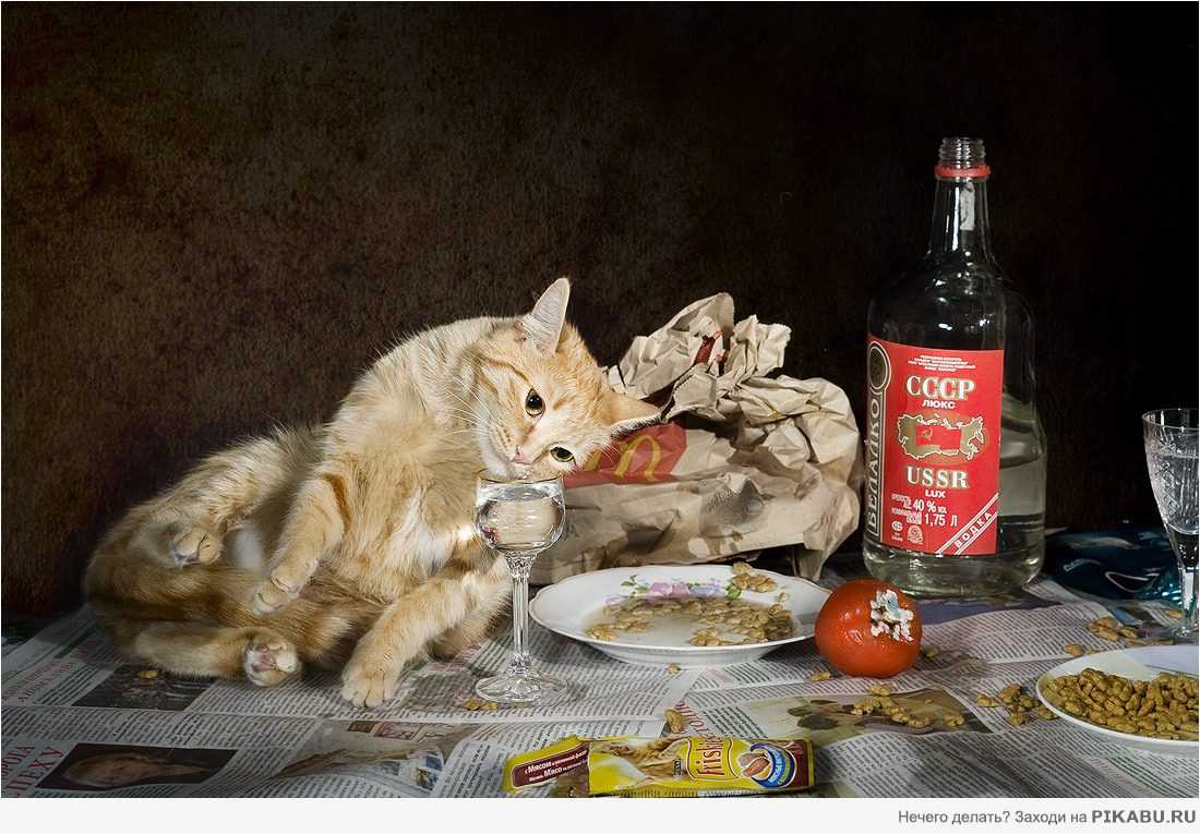 Кот на столе с бутылкой водки прилег на пакет МакДональдса.