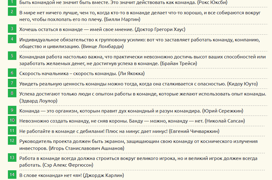 Достаточно часто успеха невозможно добиться в одиночку. Считается, что если богатеет член команды – то успешным становится все предприятие. Именно поэтому не следует отгораживаться от коллектива и упиваться индивидуализмом. В данном случае, как и в спорте, результат общий. Вот фразы про работу в команде: