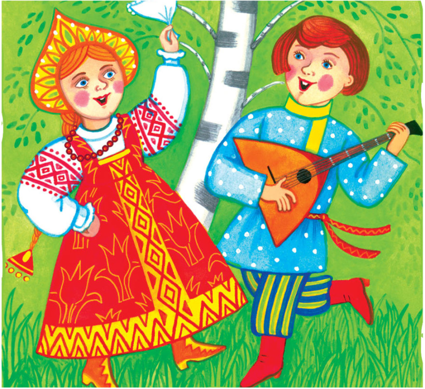 Под мелодию балалайки выходят исполнители частушек и гармонист-балалаечник.