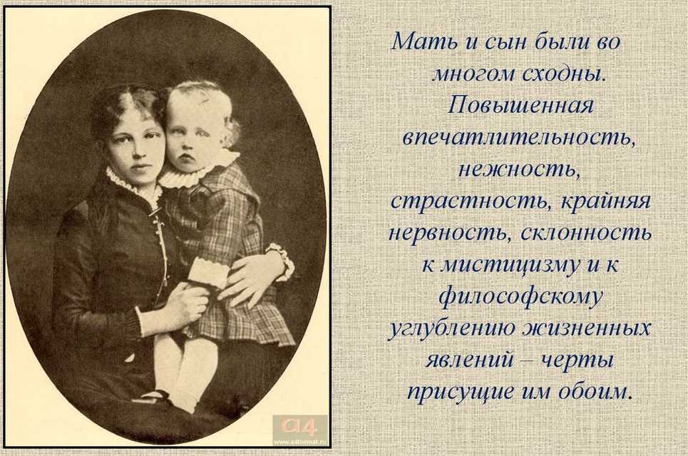 Между будущим поэтом и матерью существовала непостижимая духовная связь. Дама открыла сыну сначала сказки, а затем и произведения Шарля Бодлера, Поля Верлена, Афанасия Фета и других прославленных авторов.