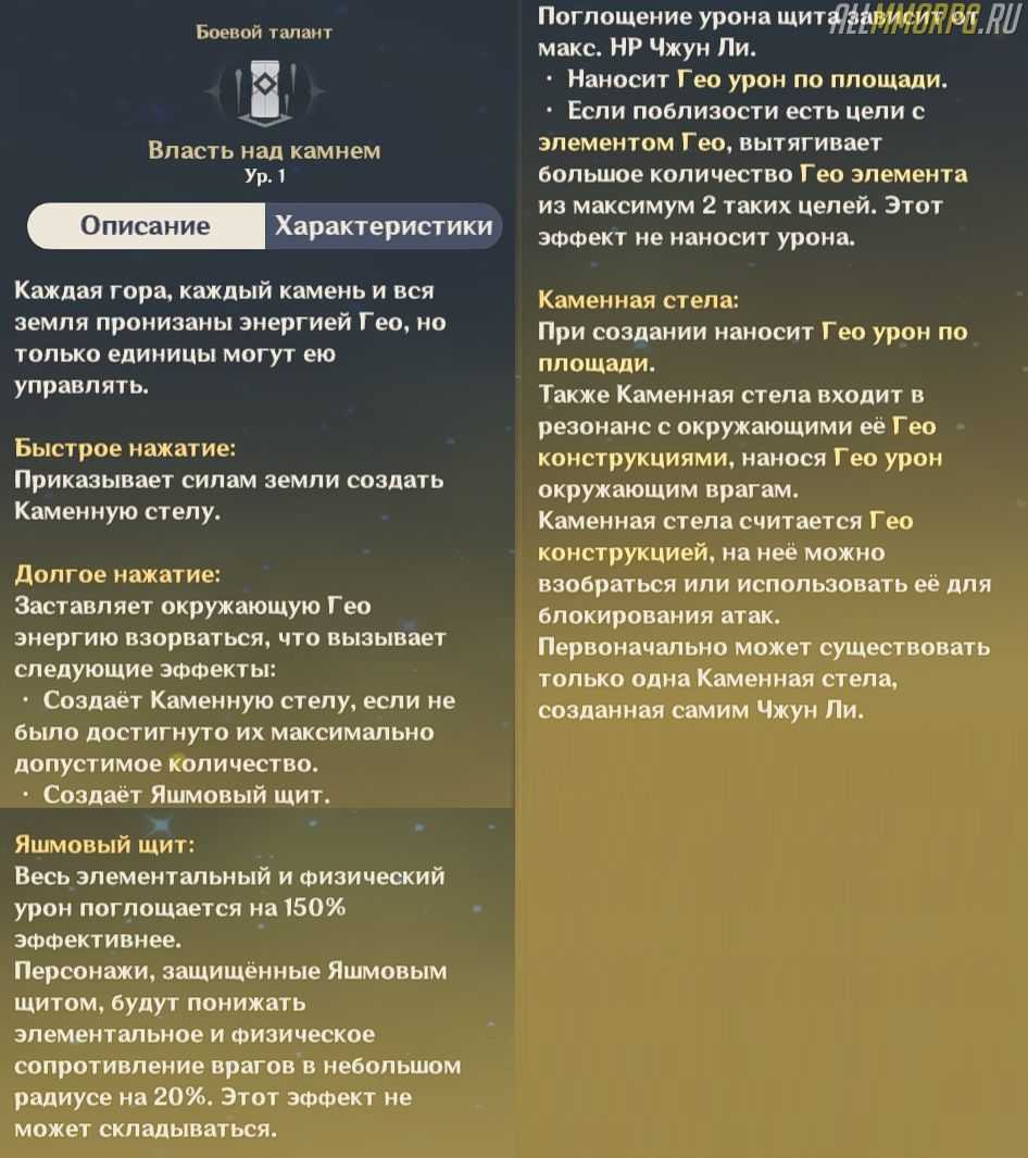 «Власть над камнем» – стихийная способность Чжун Ли. Использовав ее, герой призывает каменную стелу. Особенности каменной стелы: