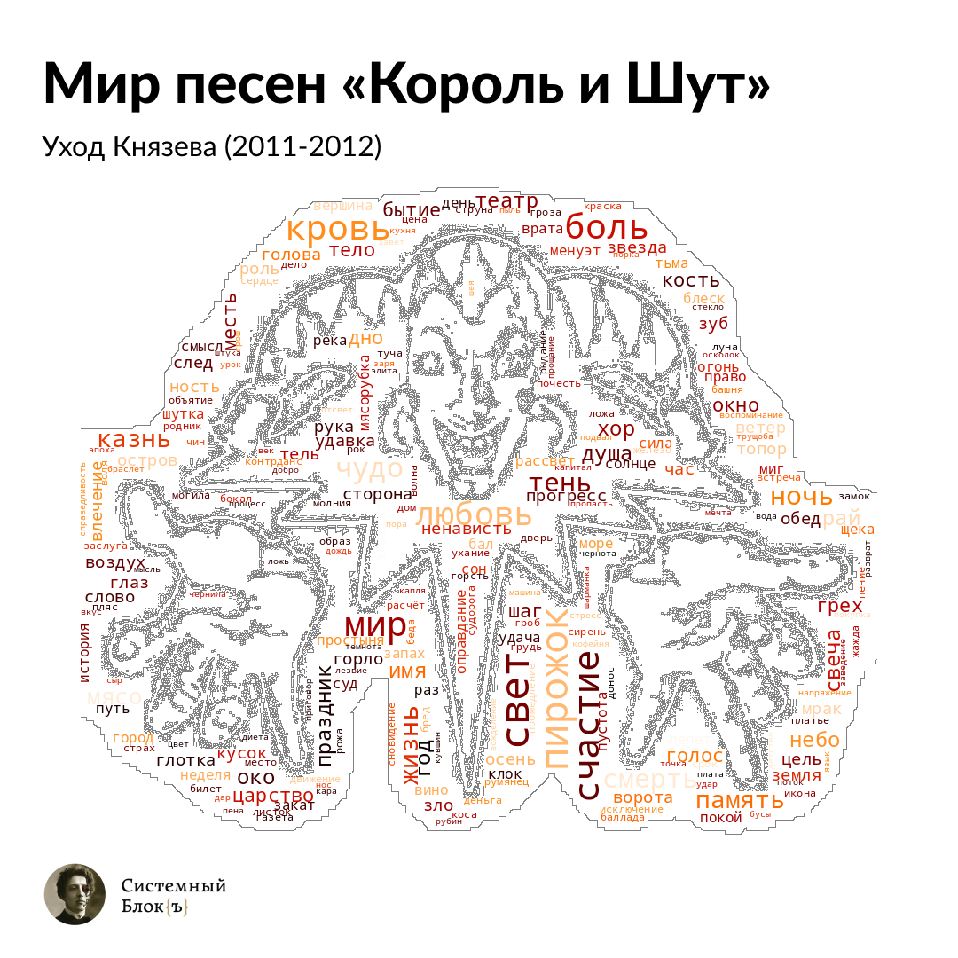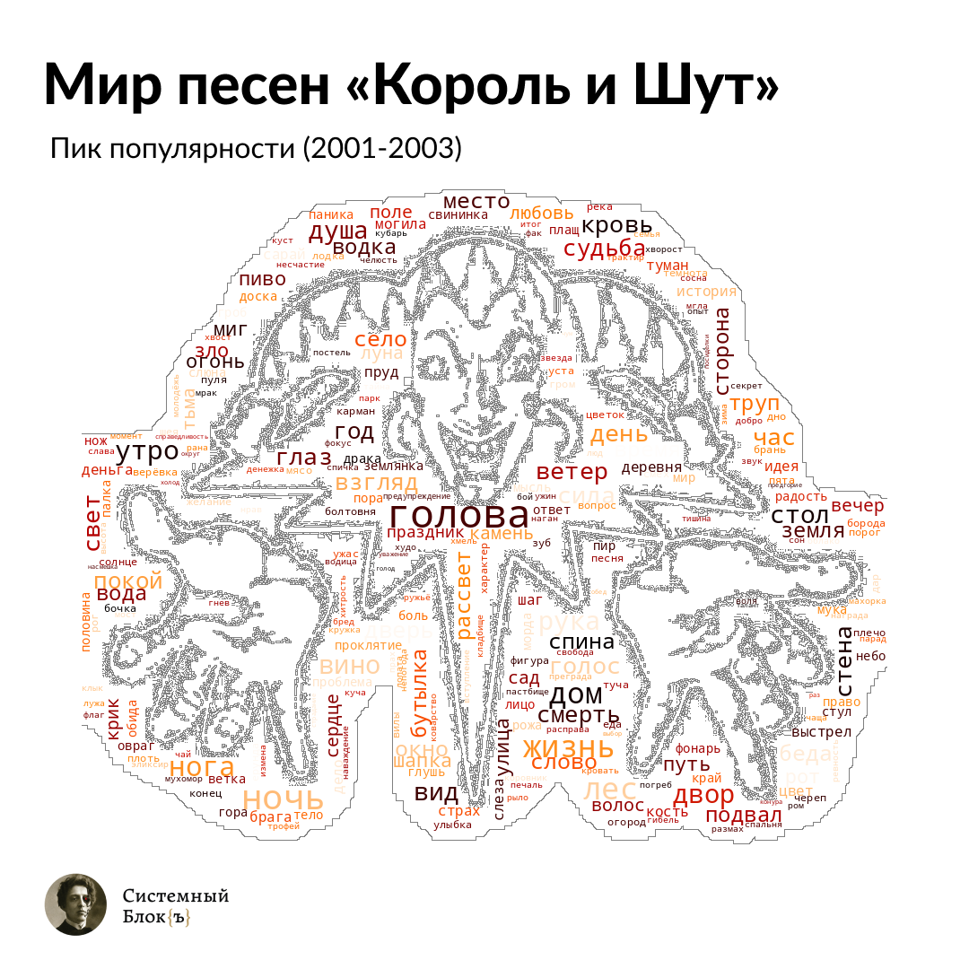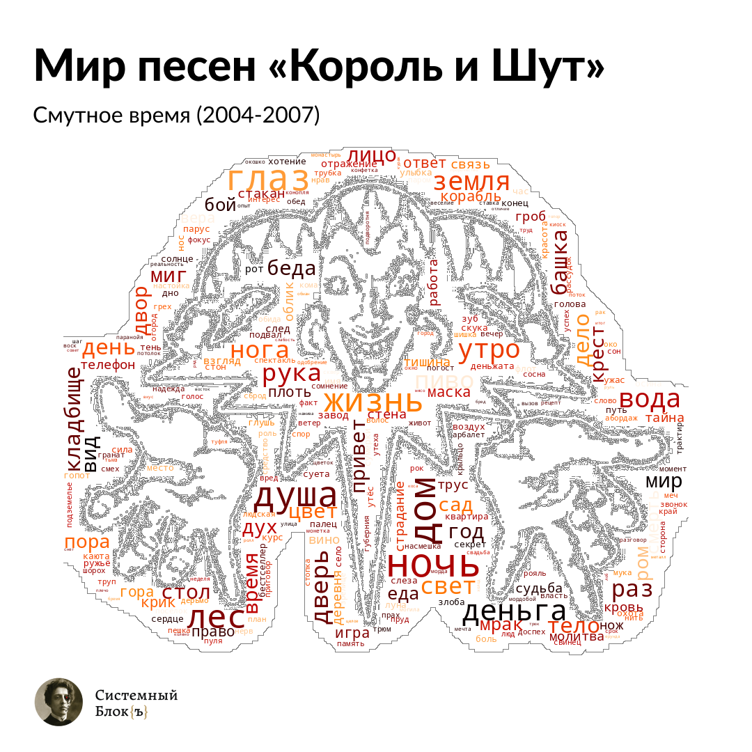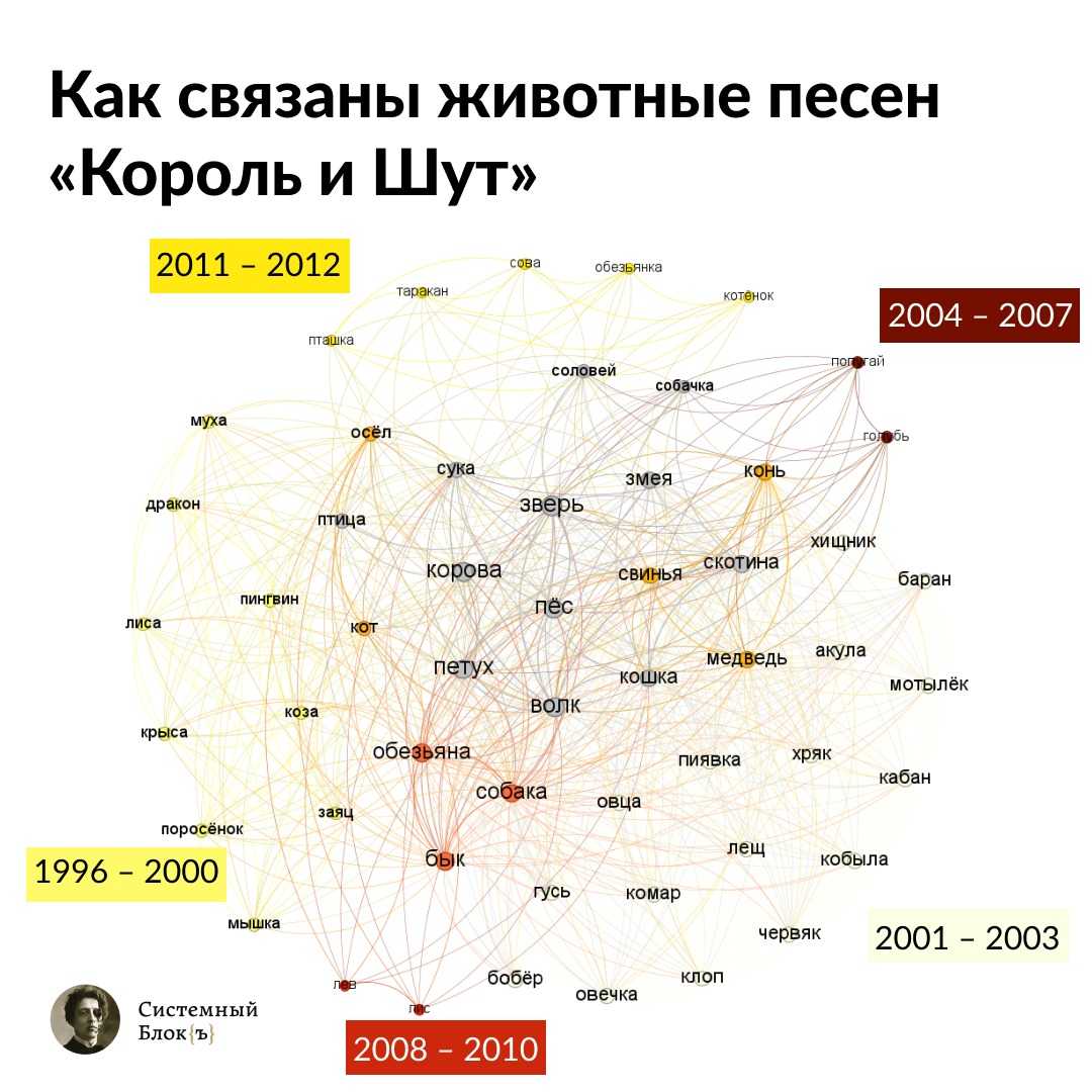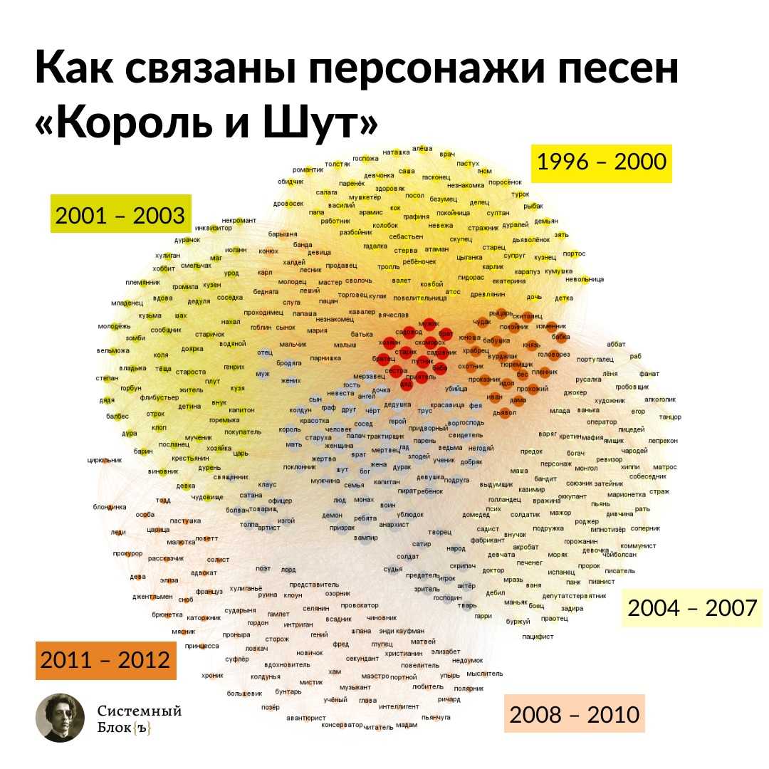 С помощью морфологического анализатора PyMorphy мы собрали все одушевленные существительные из текстов песен. Благодаря инструментарию программы Gephi мы создали граф персонажей-людей в мире «Короля и Шута». Каждый кластер — отдельный этап в творчестве группы. Узлами в центре графа отмечены те образы, которые появляются в текстах песен нескольких периодов. На пересечении двух крупных кластеров располагаются наименования тех персонажей, которые встречаются в обоих кластерах.