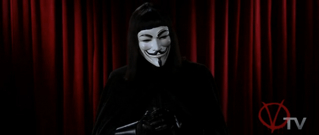 V появляется в маске Гая Фокса перед телезрителями, пытаясь достучаться до них своей проникновенной речью