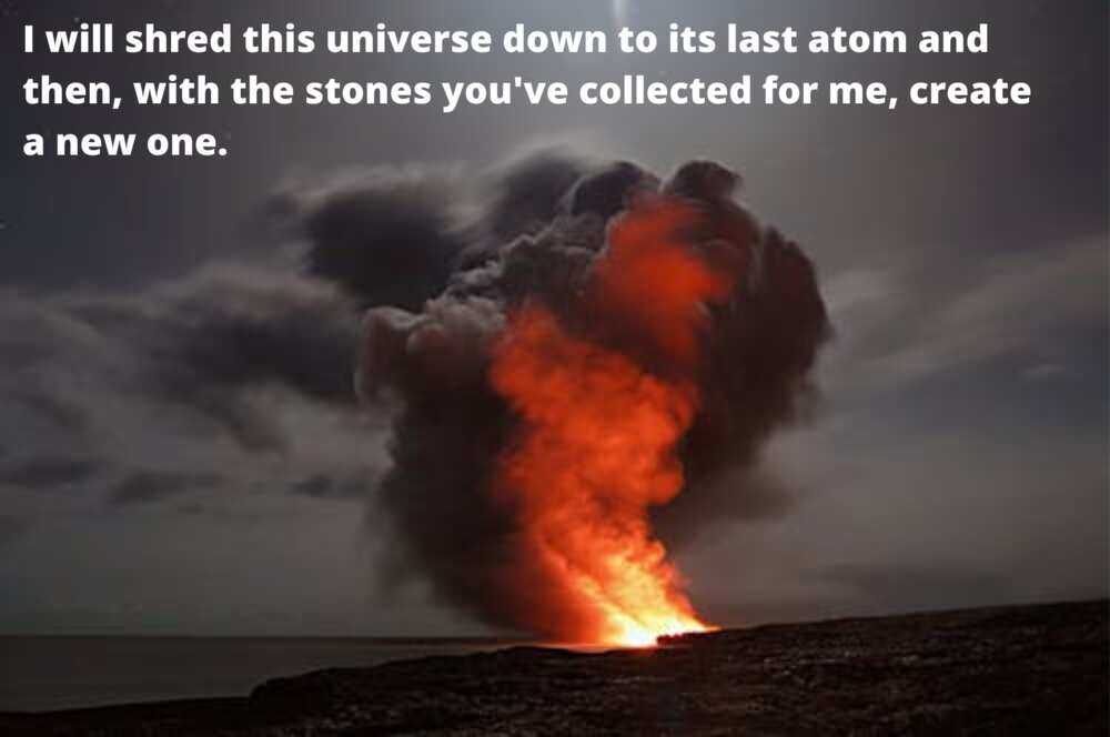 “I’m thankful. Because now, I know what I must do. I will shred this universe down to its last atom.”